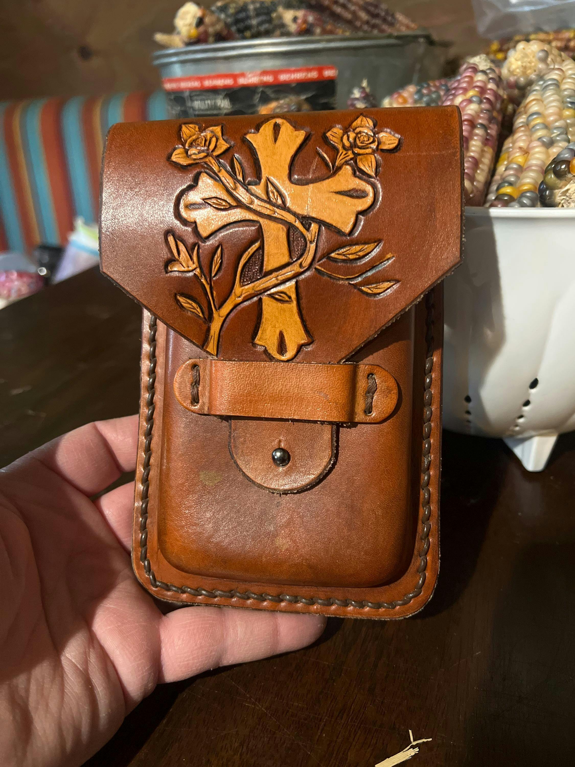 Each holder is individually handcrafted, resulting in variations in tooling and staining, adding to its uniqueness. It's not just practical but also a stylish accessory. Check current production times and ask about bundle pricing if you're interested in matching phone and bottle holders.